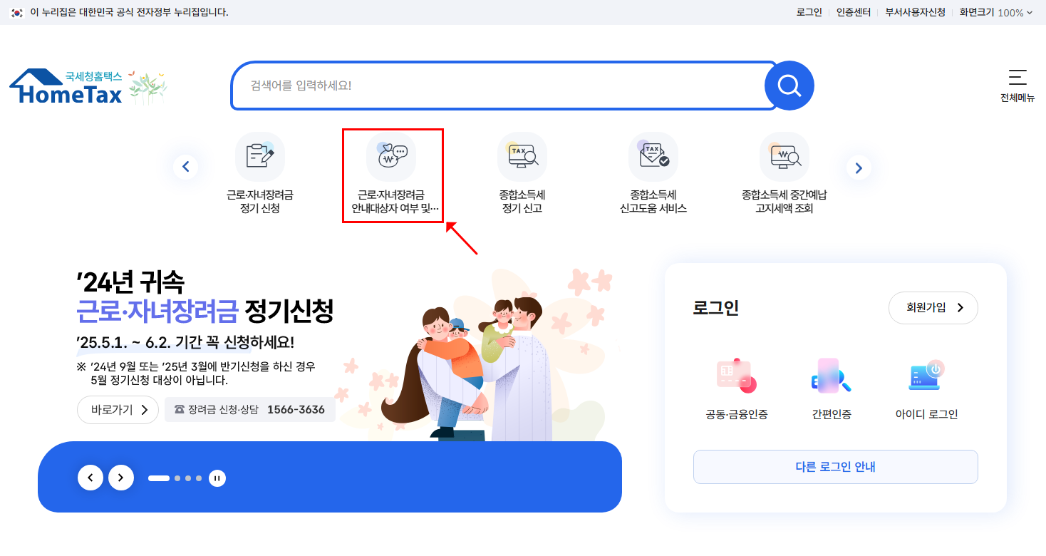 👉 홈택스 > ‘신청자격조회’ 메뉴에서 주민등록번호 입력으로 확인 가능