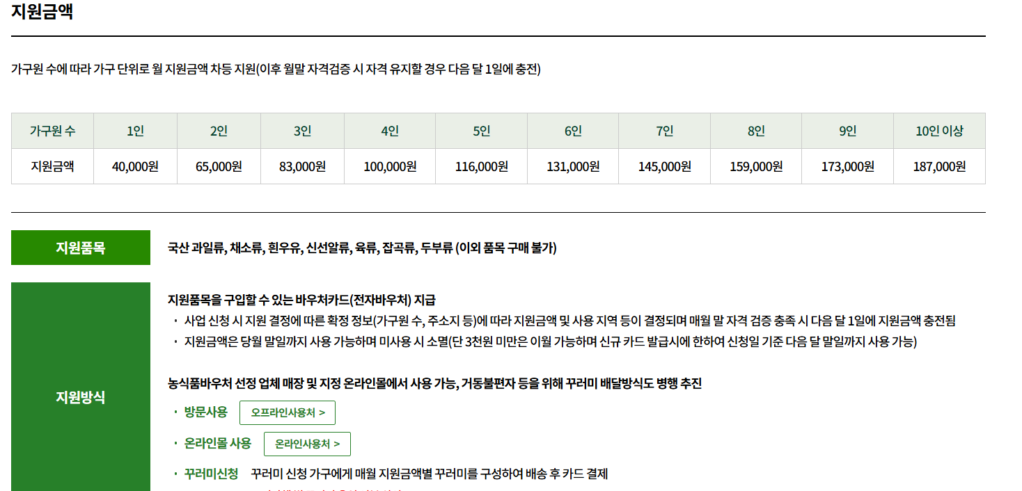 지정된 마트, 농협, 지역 유통매장에서 바우처 카드로 결제