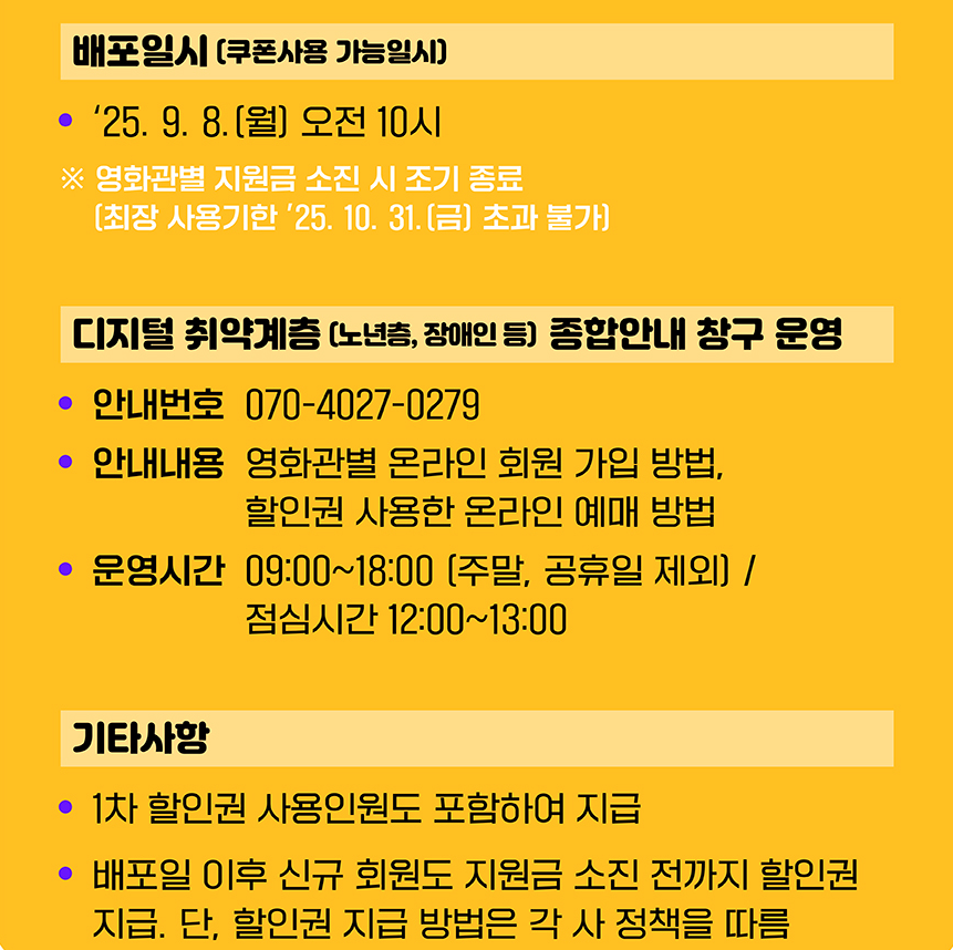 | 지원 영화관 | 멀티플렉스 및 기타 영화관 | 동일, 추가 문의센터 운영 |