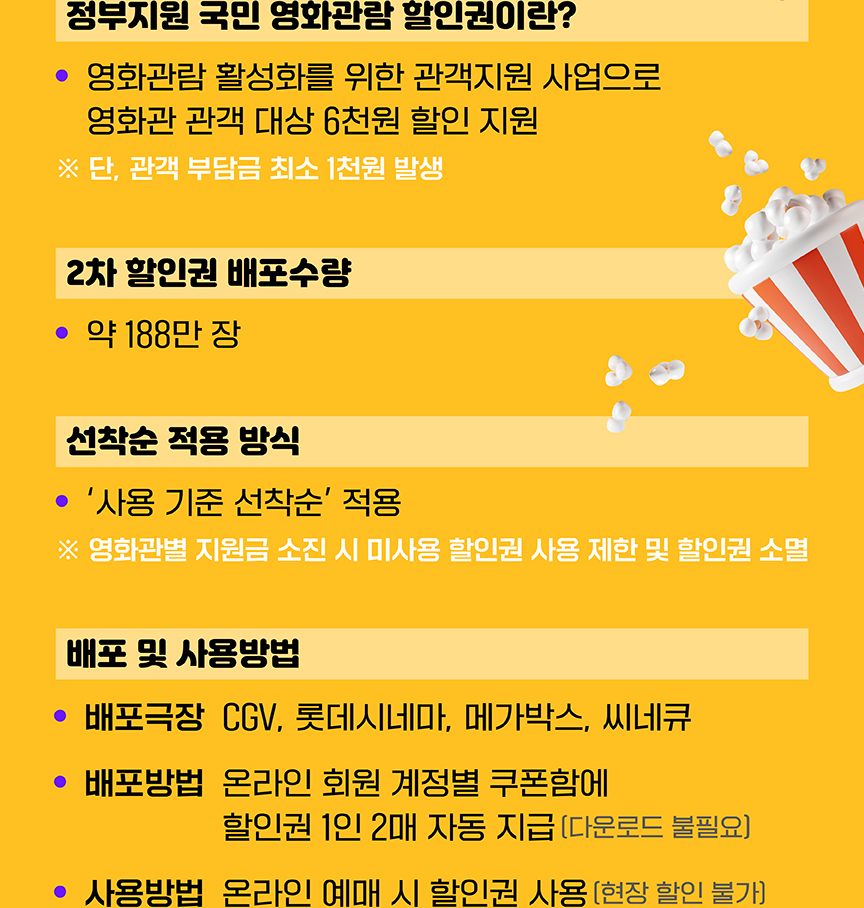 이번 6천원 영화 할인권 재배포는 1차와 달리 '결제 선착순' 방식으로 강화되었으며, 쿠폰만 챙겨두고 있다가는 할인권이 사라질 수도 있음을 명심하세요.