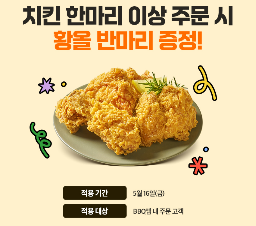- 행사명: BBQ 황올 20주년 기념 반마리 증정 이벤트