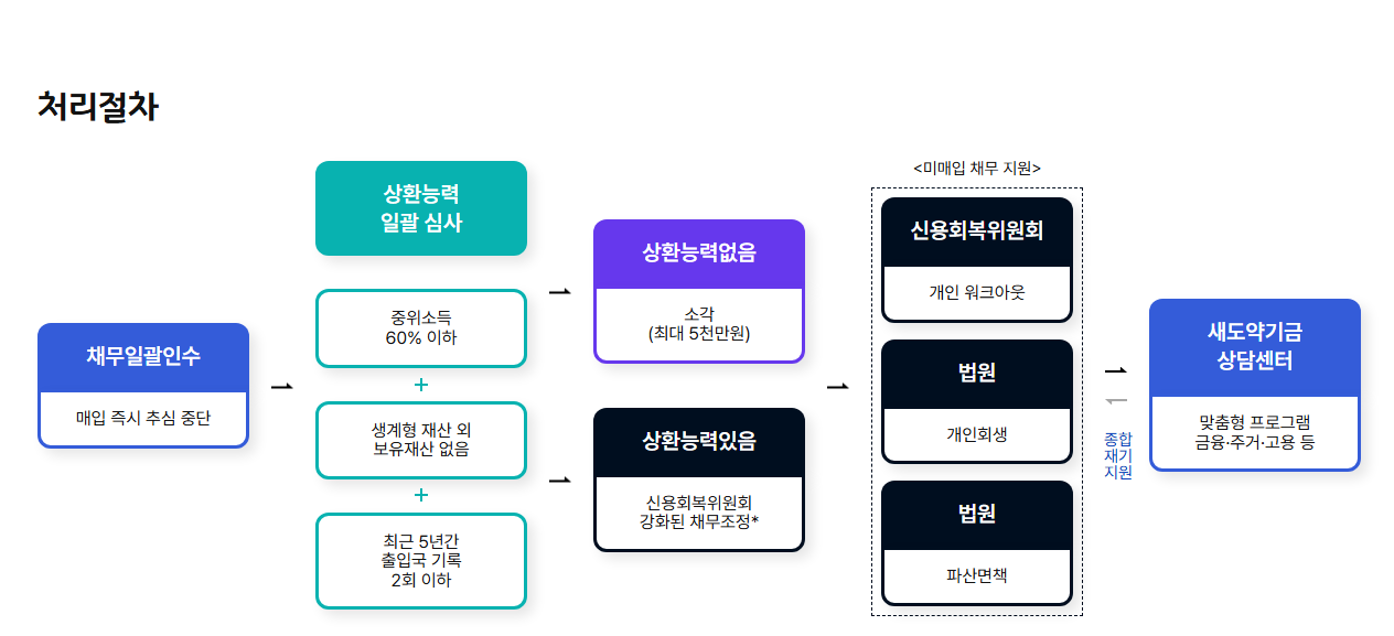 - 새도약기금: 장기 연체자 자동 선별 후 채무 정리 (신청 아님)