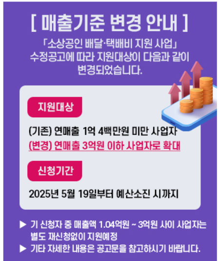 - 연매출: (기존 )2023년 또는 2024년 기준 연 매출 1억 400만원 미만에서 (변경) 연 매출 3억이하 사업자로 확대