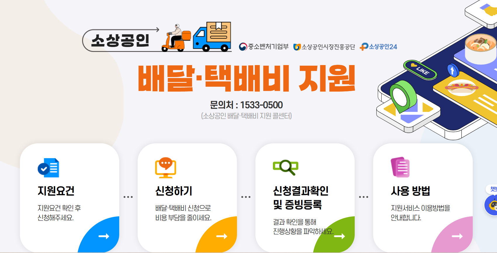 - 소상공인 배달택배비 지원 콜센터: 1533-0500