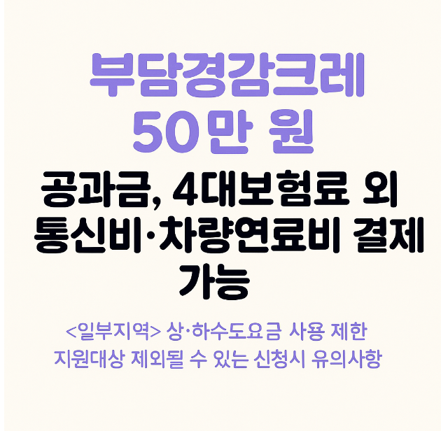 부담경감 크레딧이란, 소상공인을 지원하기 위해 1인당 50만원이 등록한 카드로 지급되는 제도입니다. 하지만 부담경감 크레딧을 받아도 전기랑 도시가스는 관리비에 포함돼 있고 수도는 지방세 아니면 위택스로 찍히면 사용이 불가합니다.