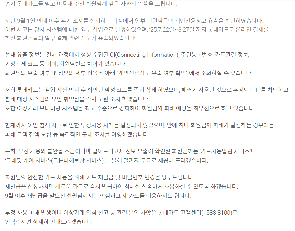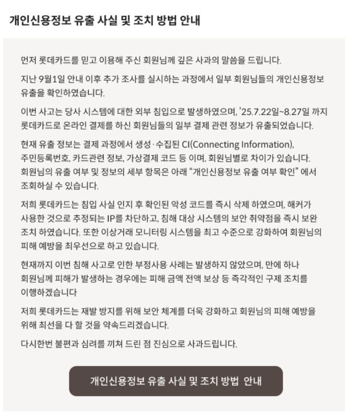 ✔ 최신 사례: 롯데카드 개인정보 유출 사태 (2025년 9월 기준)