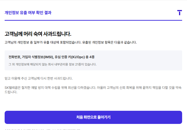 • 유출 항목: 전화번호, 가입자 식별정보, 유심 인증키 등 총 4종